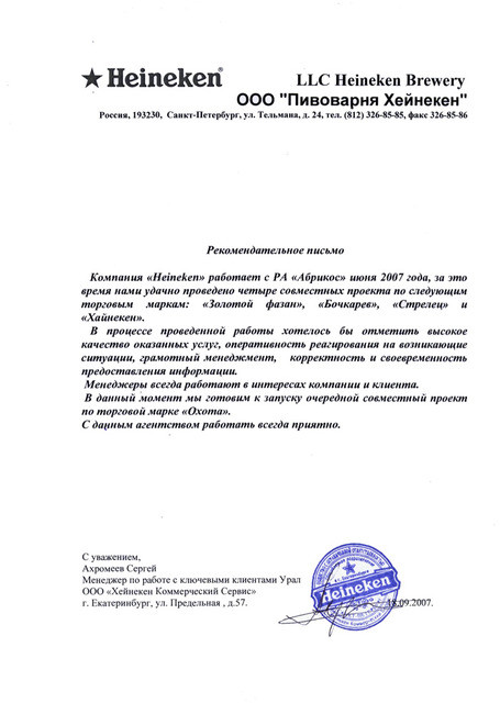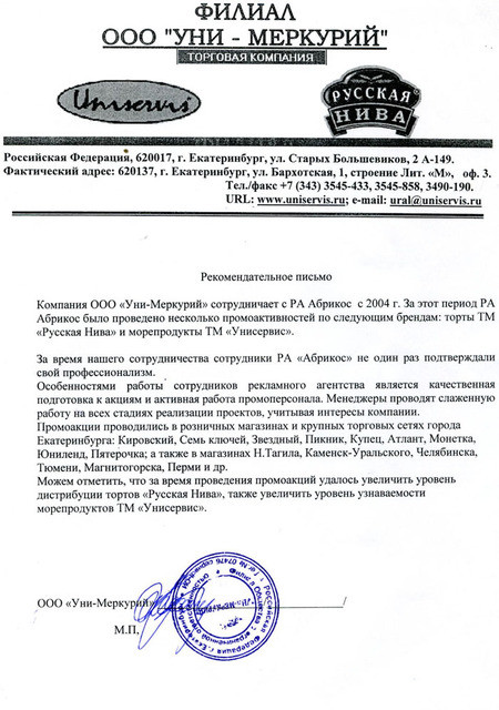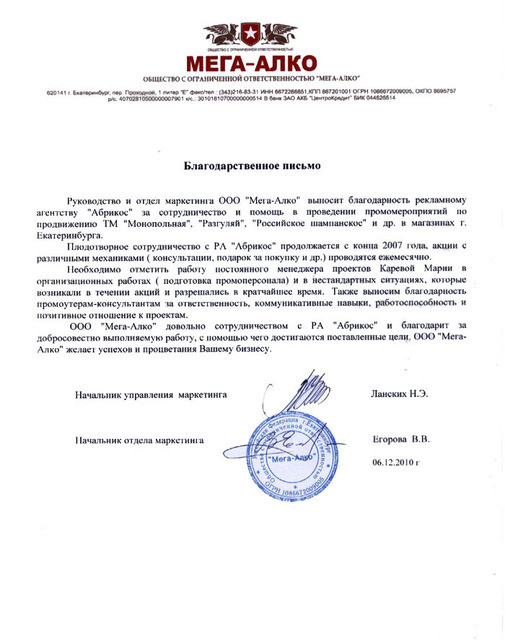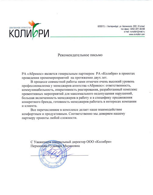 Рекламное Агентство «Абрикос» создано в 2004 году и является одним из ведущих региональных операторов на рынке BTL-услуг. С этого же времени агентством заключен партнерский договор с крупнейшей на Урале торговой сетью «Кировский», предоставляющий эксклюзивное право на проведение btl-активностей на территории ТС «Кировский».